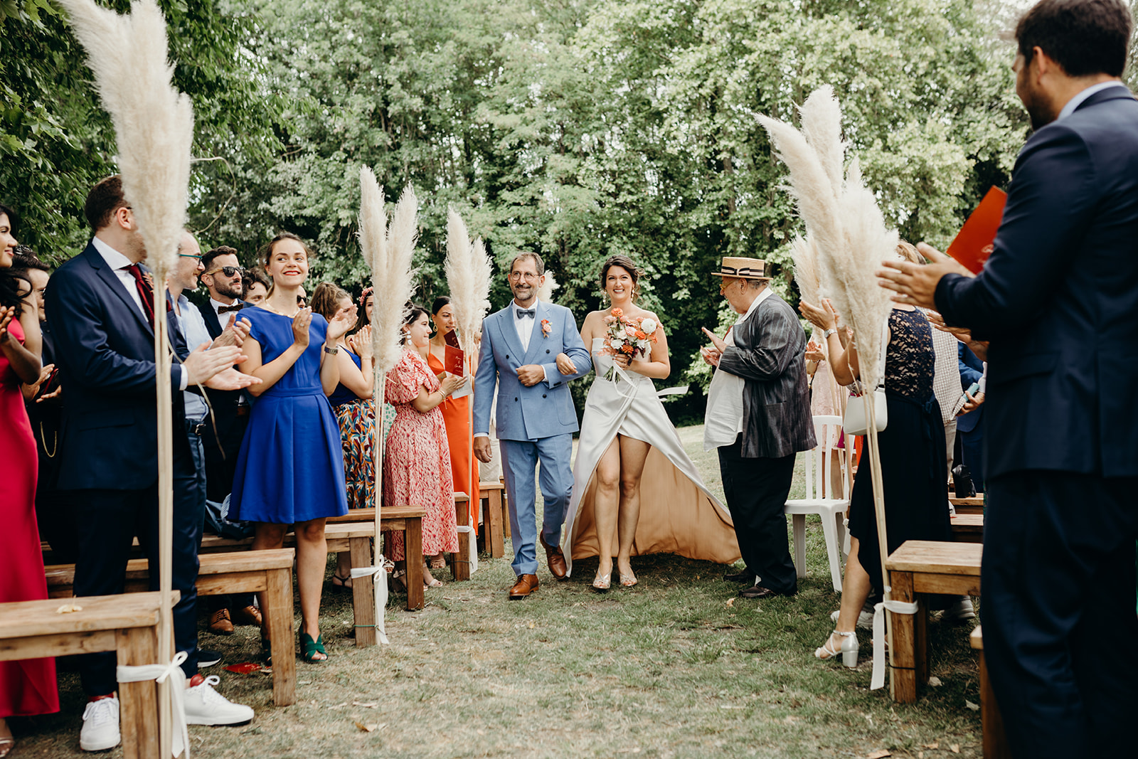 Mon père m’a accompagné pour l’arrivée à la cérémonie laïque. Surement stressé, il a marché sur ma traîne en me laissant au bras de Gauthier. Et il a failli tomber !