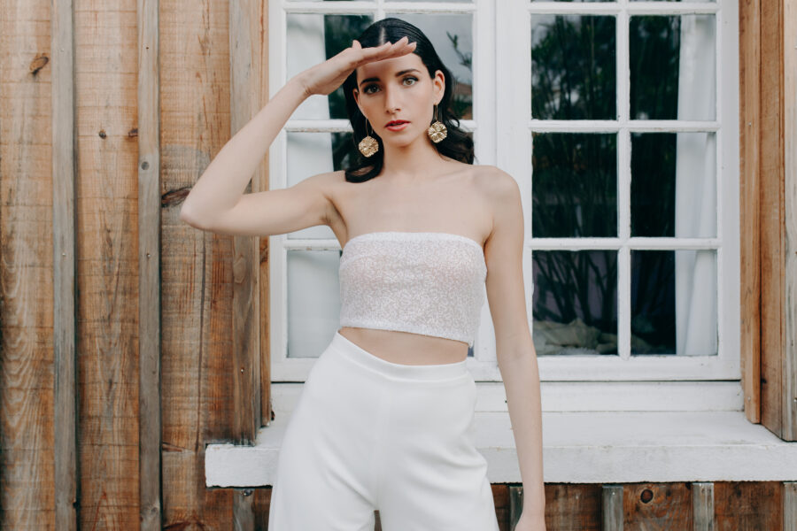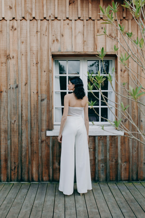 On adore le cette tenue de mariage civile pour femme, moderne de ce bandeau paillettes à reporter encore et encore !