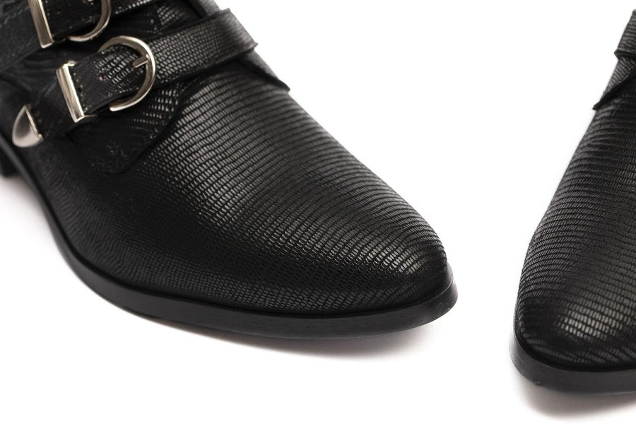 Dessus, garniture, doublure et semelle intégralement en cuir brillant impression « Iguane » noir