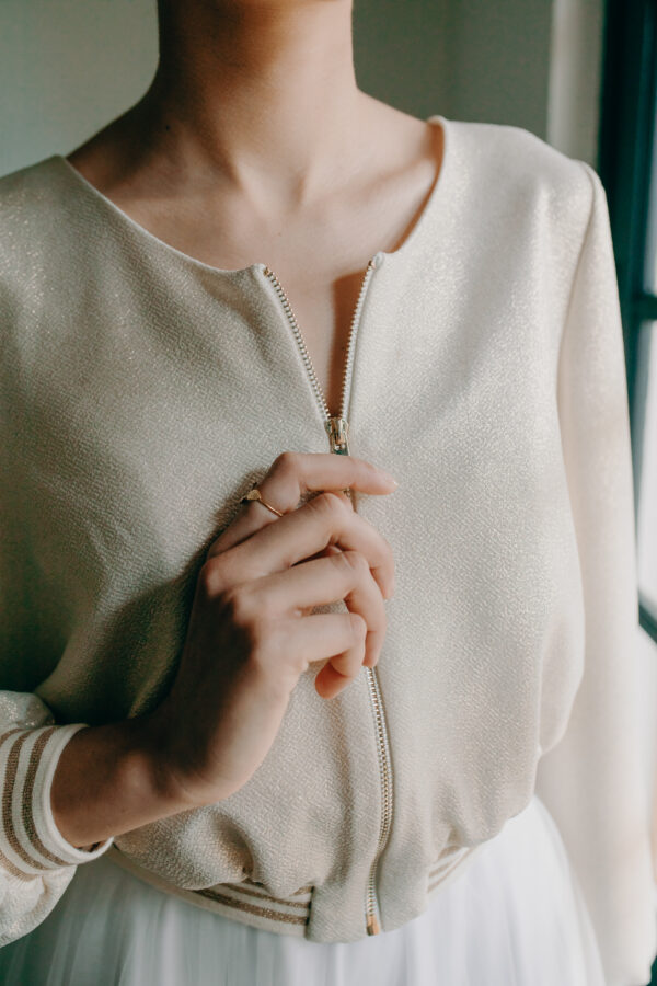 Bombers doré, encolure ronde devant et bateau au dos. Bord côte élastiqué à la taille et aux bas de manches, 3 rangées dorées. Manches longues bouffantes.