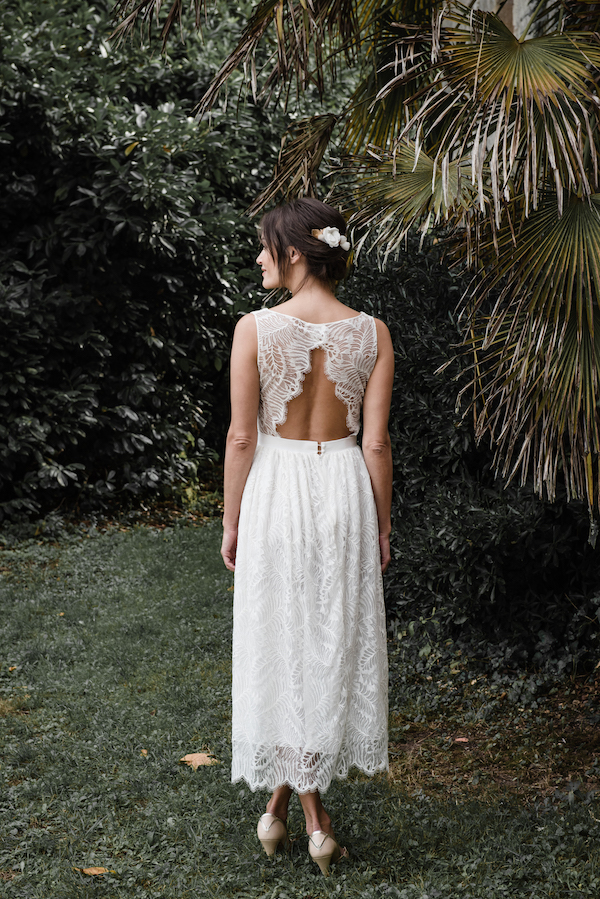 This short and medium long wedding dress with tropical lace is directly inspired by the 1960s. Curved up to the chest it follows the line of the body without molding it. This is the perfect little dress for your civil outfit or your brunch the next day.