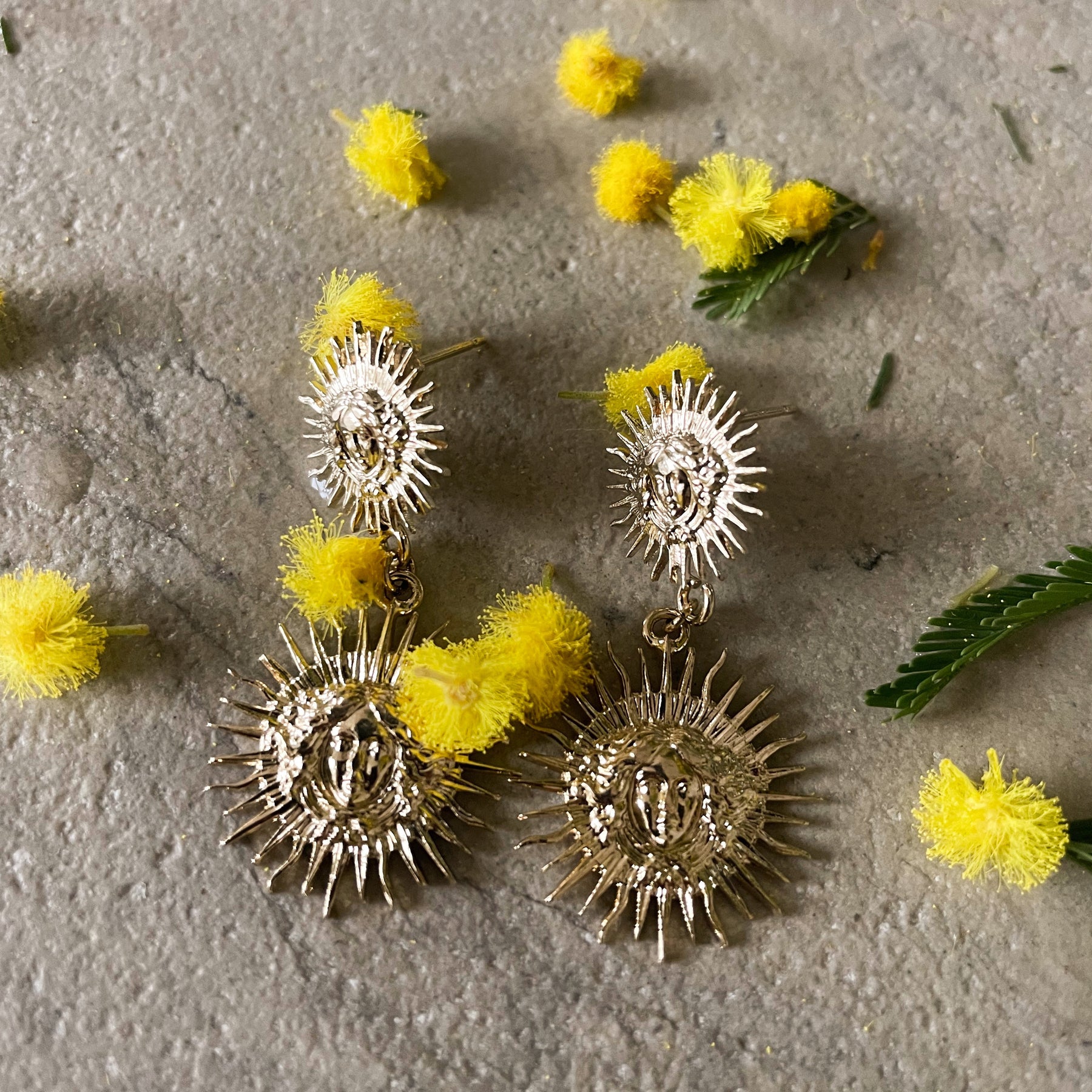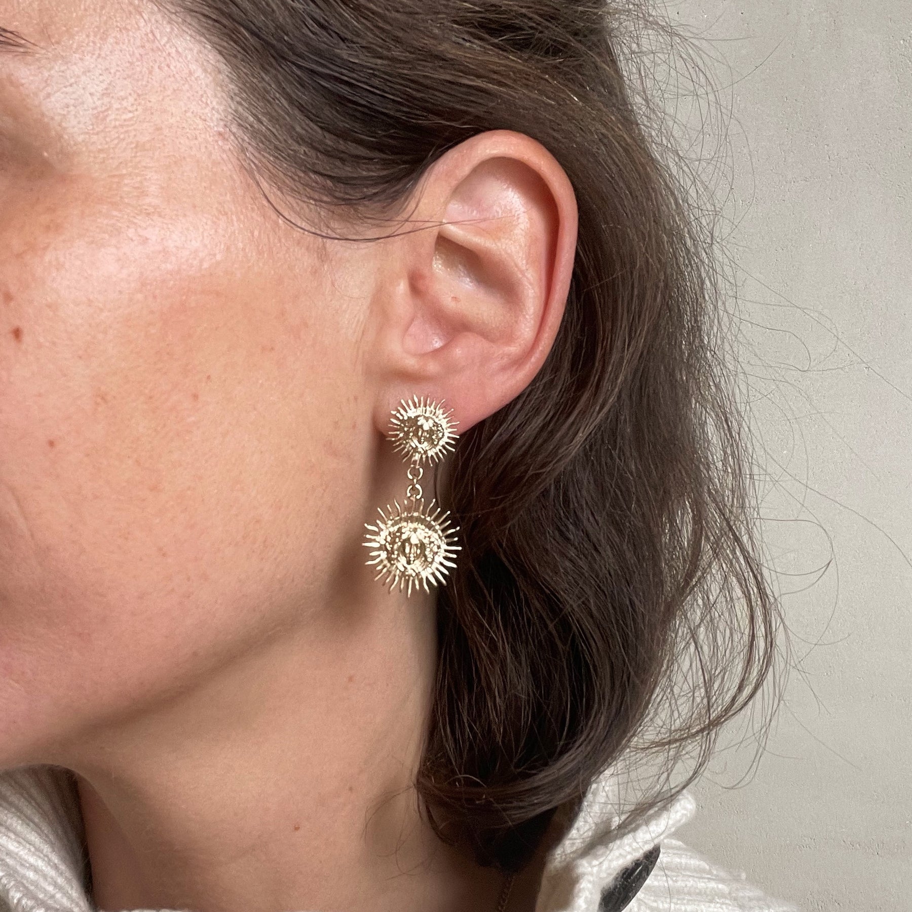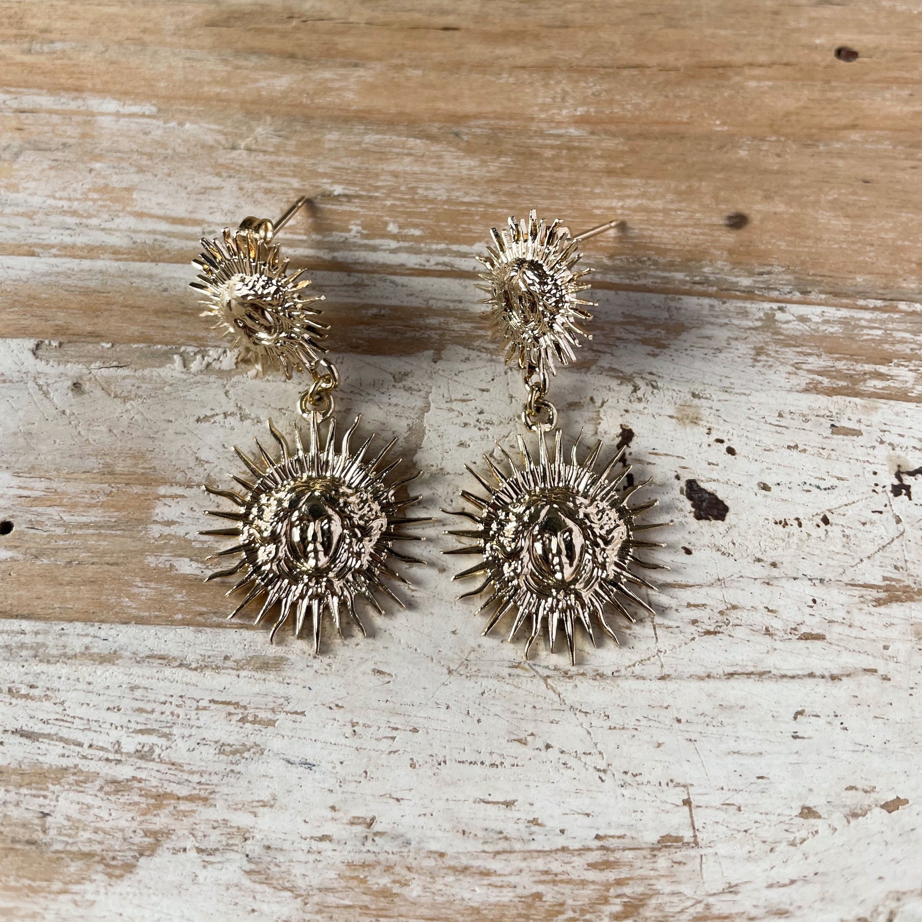 Boucles d’oreilles soleil très très légères à porter sans modération. Ces soleils sont travaillés finement et dorés à l’or fin. Les clous sont en argent recouvert d’or pour éviter les allergies.