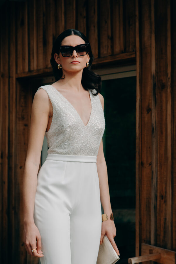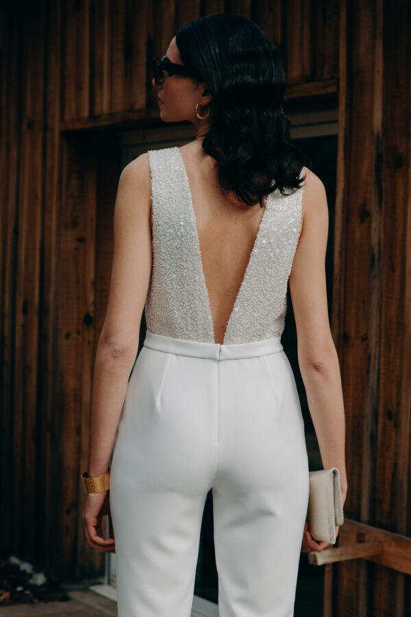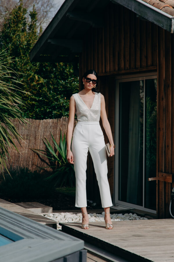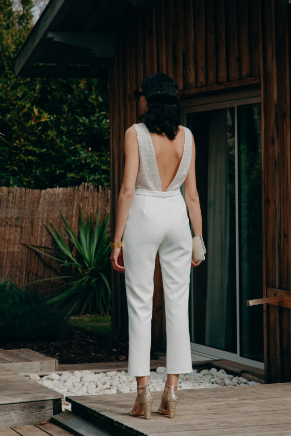 On adore l’élégance du lamé perlé et le dos nu renversant de cette combinaison de mariage civil tellement chic !