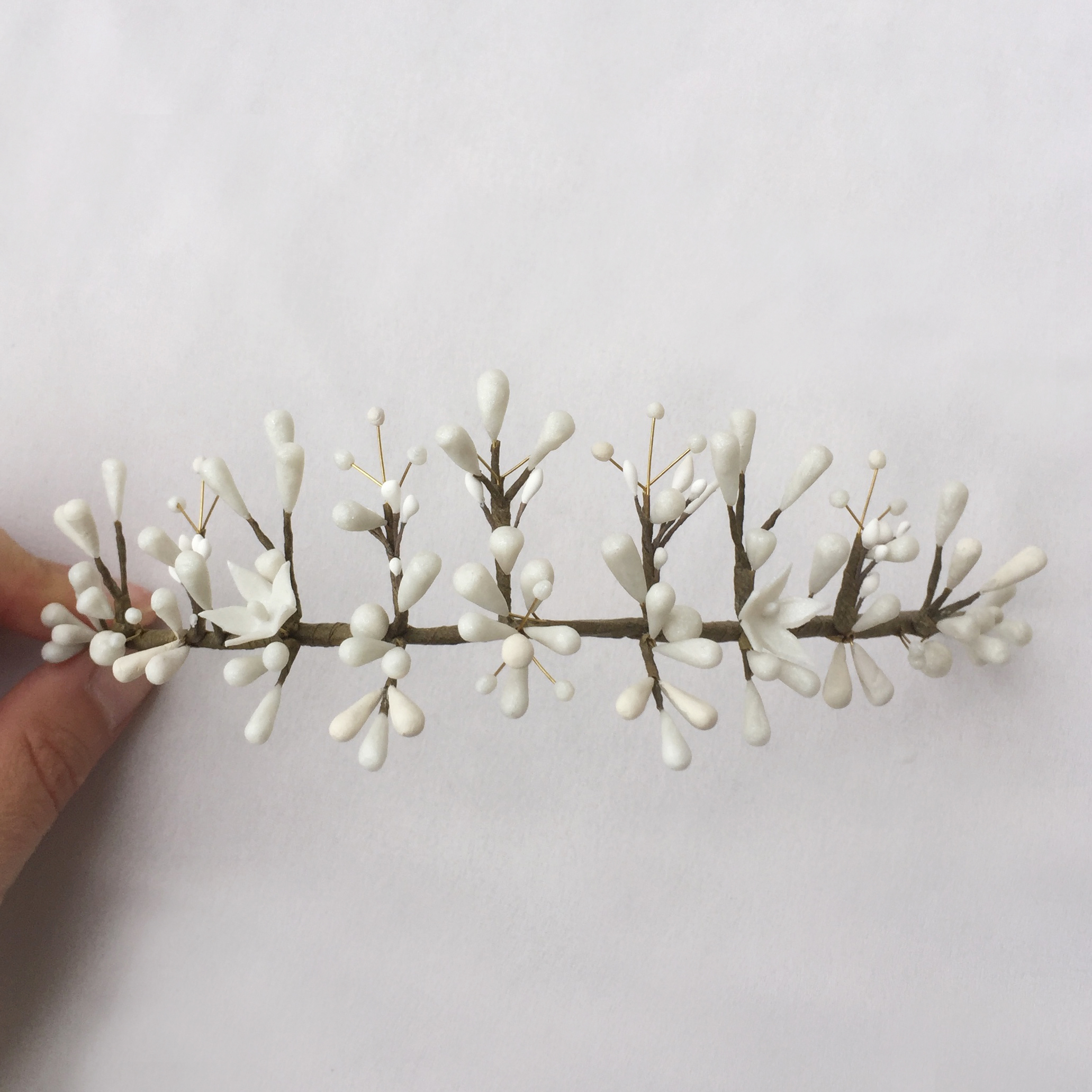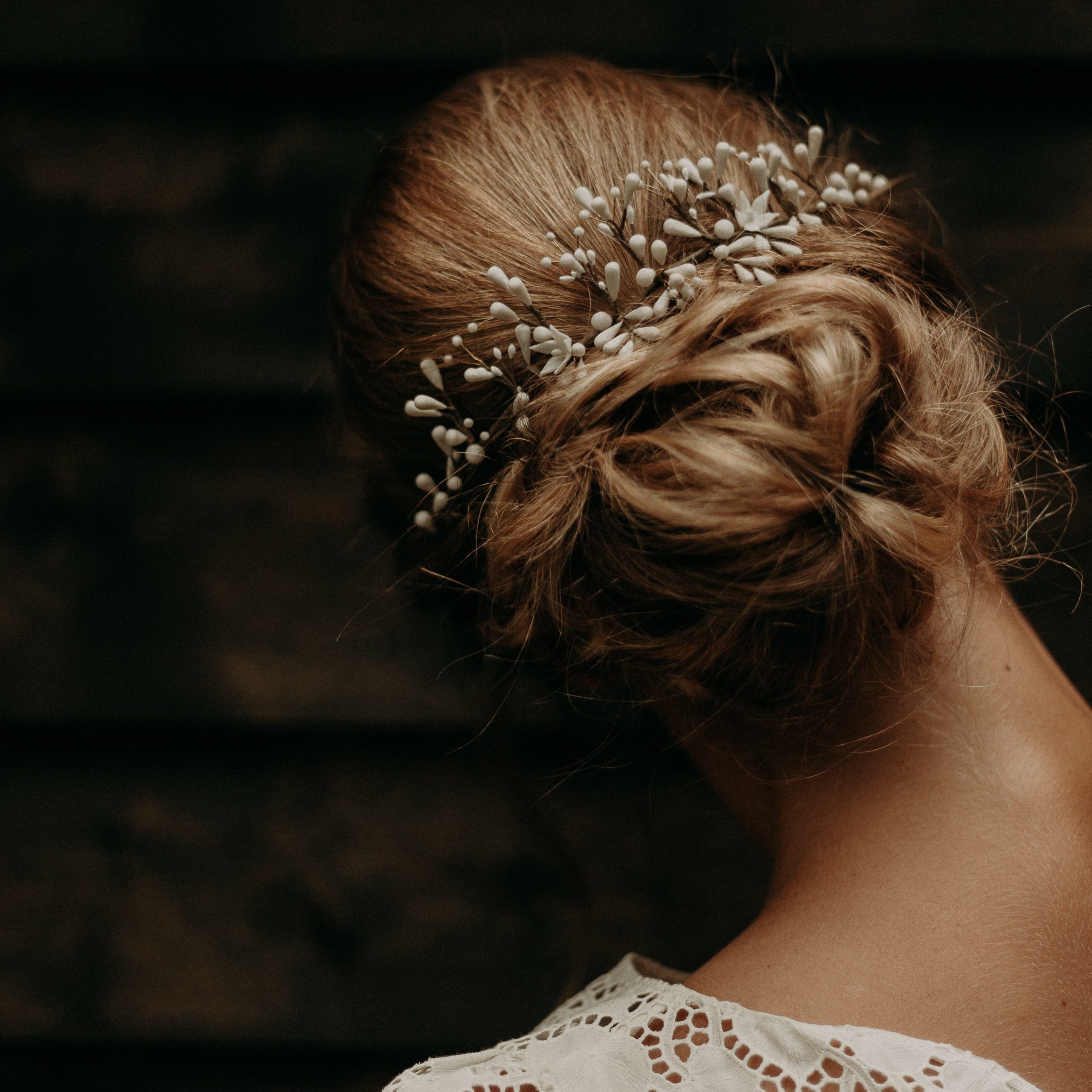 Le bijou Adélaïde se pose à l’arrière de la tête sur le chignon. En s’inspirant des accessoires anciens en cire, toutes les étamines sont fabriquées à la main. Elle s’associe parfaitement avec une des robes de notre collection Diaphane Obsession !