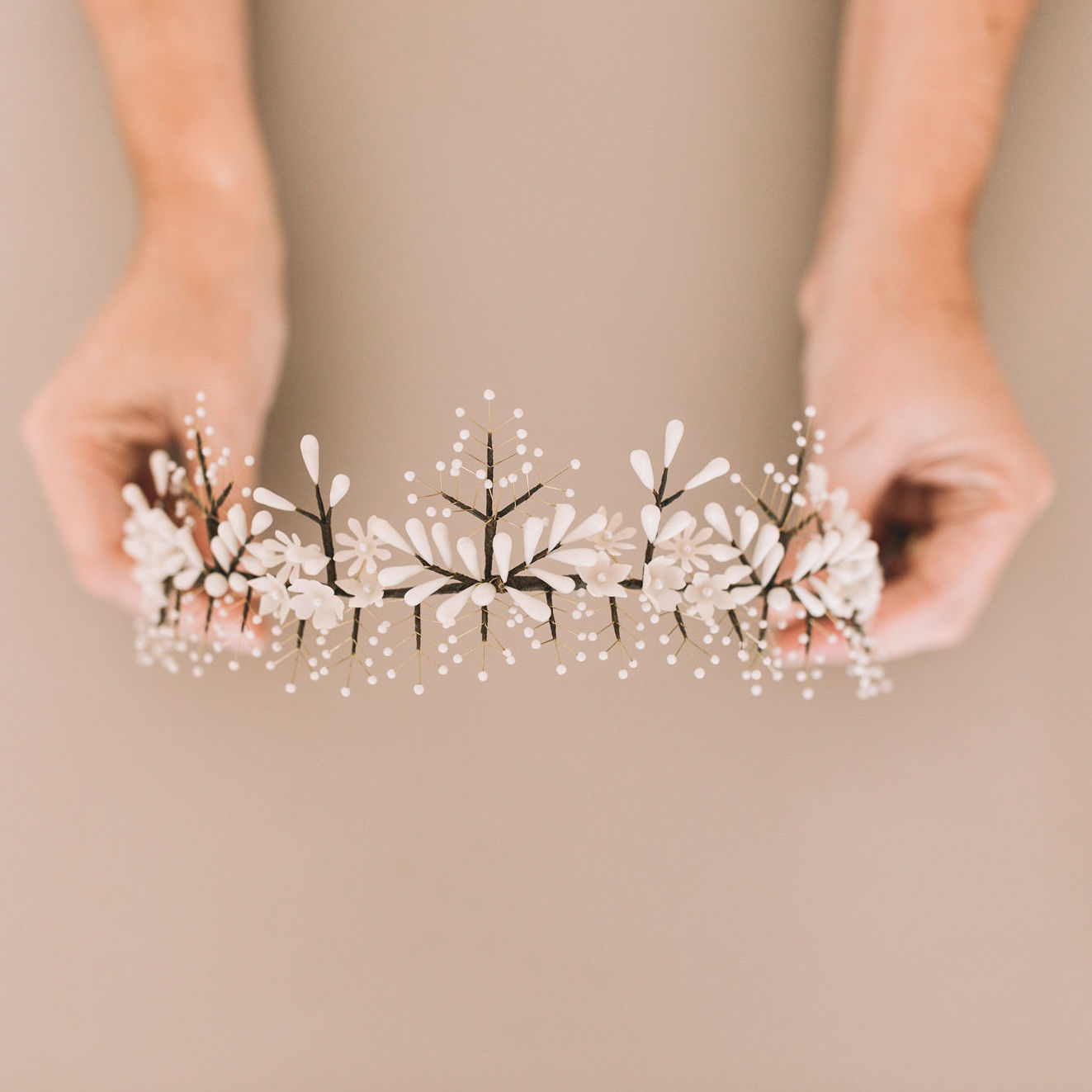 » Cette pièce imposante est notre fierté. Elle est inspirée des couronnes de mariage anciennes en cire de nos grands-mères, ce bijou de tête demande beaucoup de temps de fabrication. Tous les éléments qui la composent sont fabriqués par nous. »