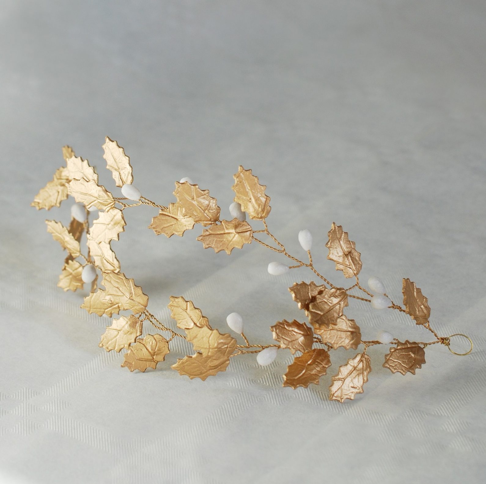 Versailles est un accessoire de tête très léger, sur une base métallique. Les feuilles de houx sont fabriquées par Sidonie et Julie. Nous avons opté pour une couleur dorée… mais vous pouvez le retrouvé en bronze ou en argent sur leur site. Il est s’accorde parfaitement avec notre robe courte Audrey !