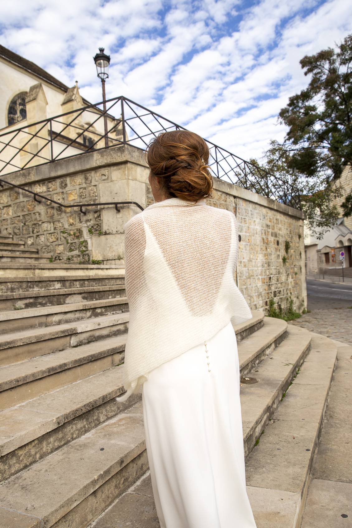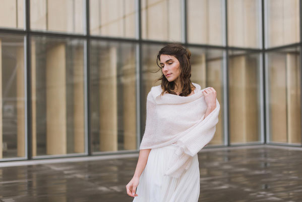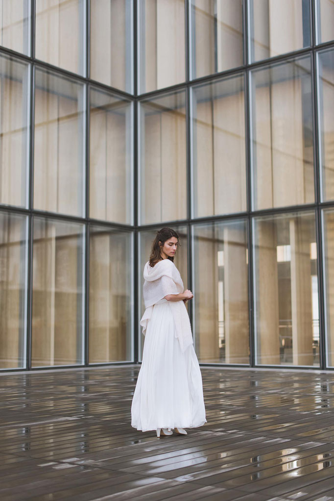 J’ai choisi des fils nobles pour créer une maille naturelle et légère dont on ne sente que la chaleur sur la peau, une enveloppe confortable qui ne cache ni la robe, ni la silhouette, un vêtement actuel qui vous ressemble et que vous aurez plaisir à porter en d’autres occasions.