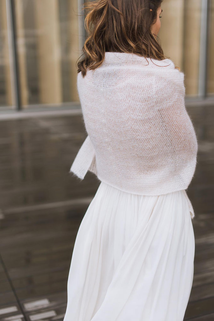 Chaque étole est tricotée dans un fil de mohair et soie léger, vaporeux et infiniment doux sur la peau. Très chaude, elle tient en place sur les épaules et peut se porter de nombreuses manières. Le motif flocon, sobre et original, complète joliment les robes de dentelle. La nuance ivoire convient pour la grande majorité des tenues de mariée, mais d’autres coloris sont disponibles sur demande. Durable et simple à entretenir, vous aurez plaisir à la reporter en étole ou en écharpe été comme hiver.