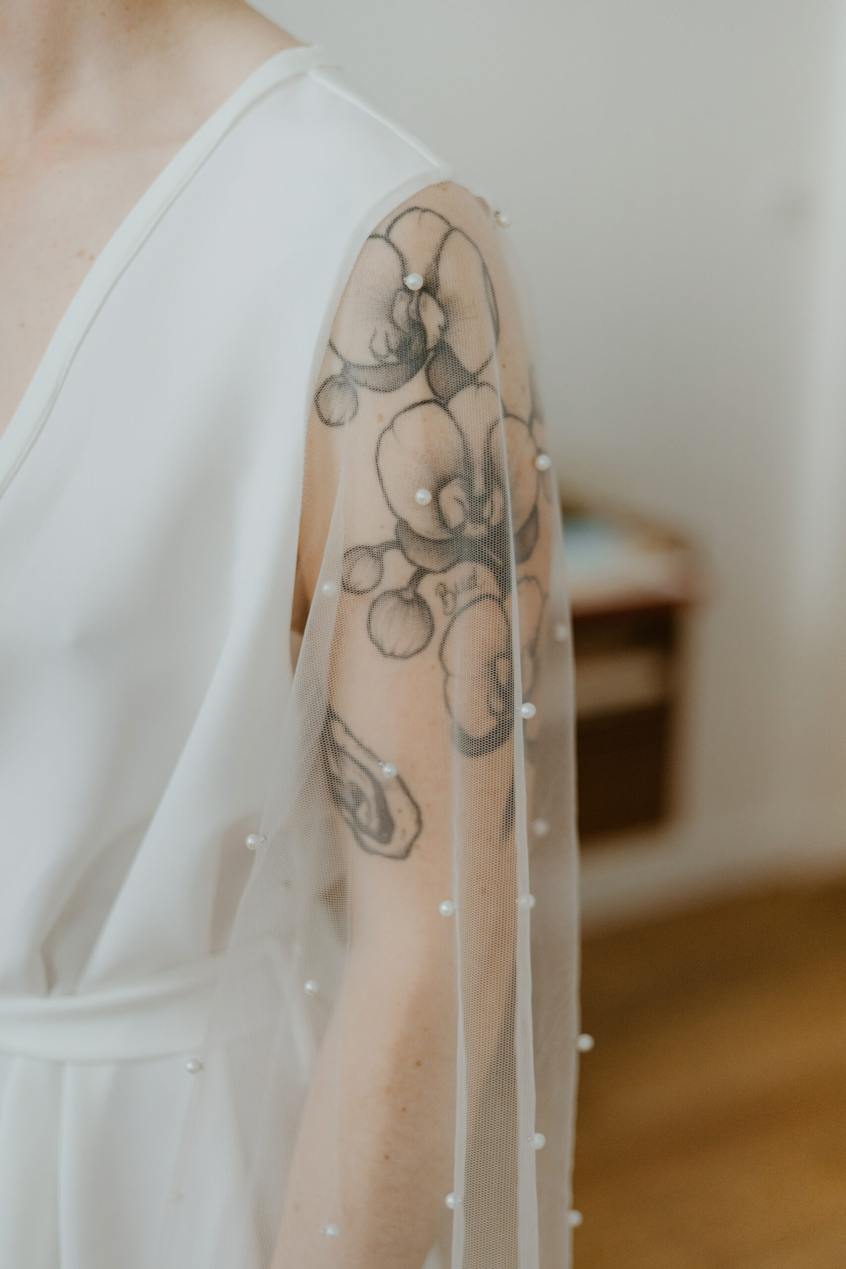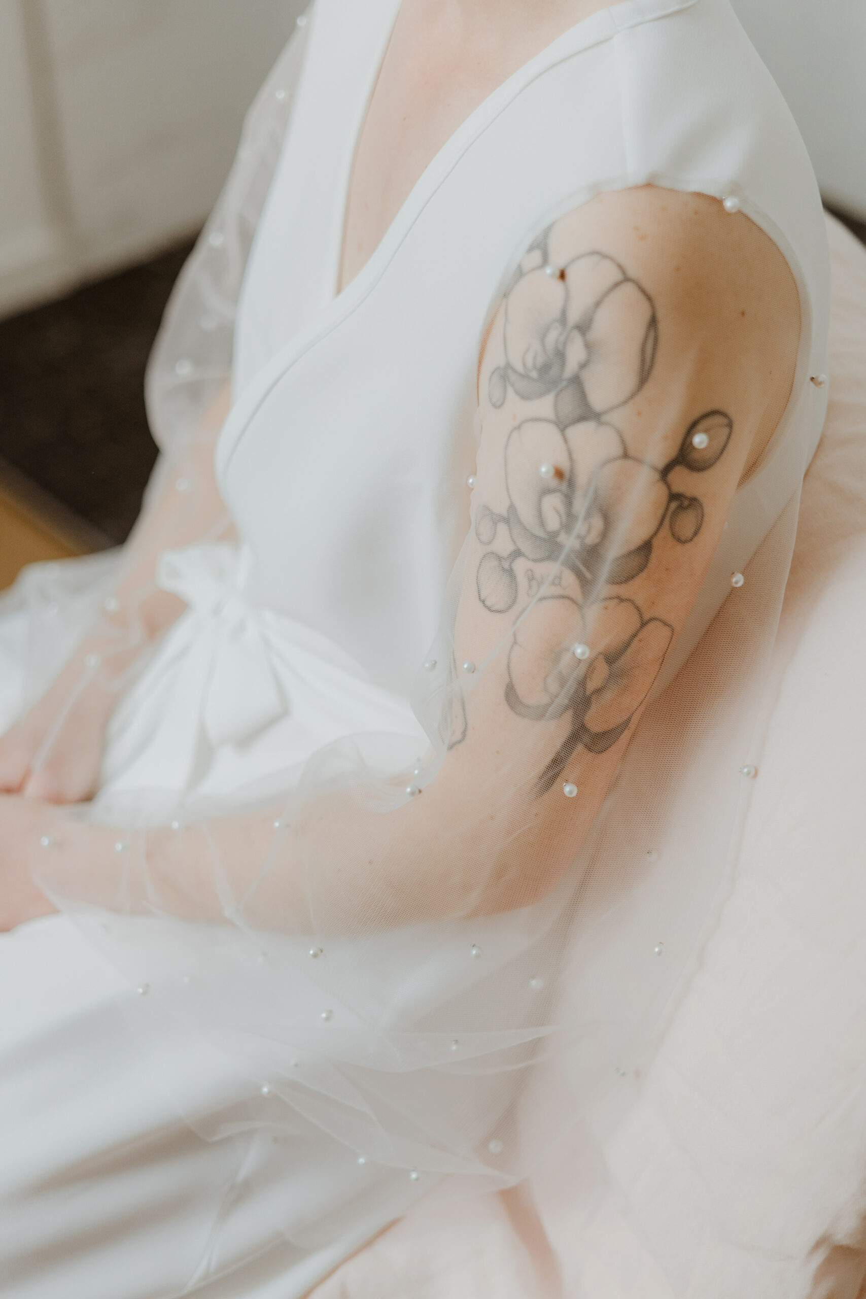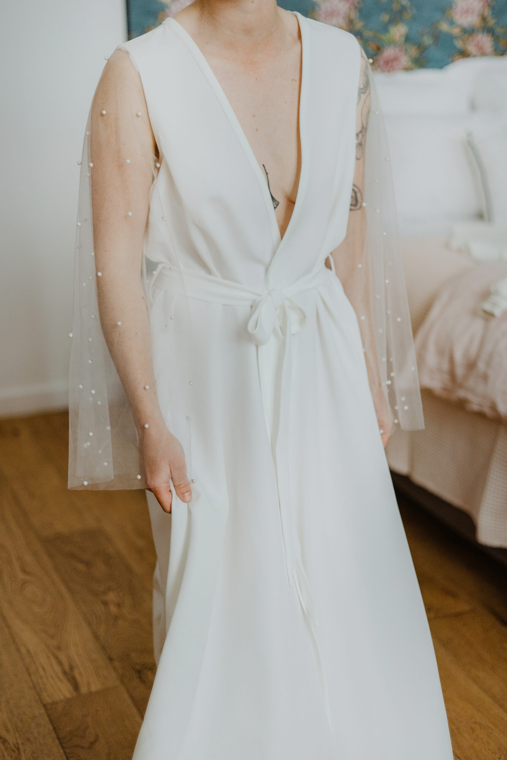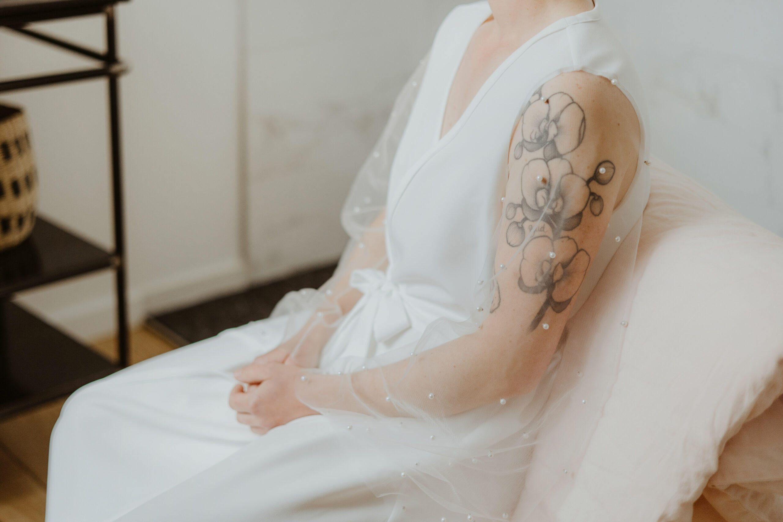 Kimono long en twill et tulle perlé coloris blanc soie.
