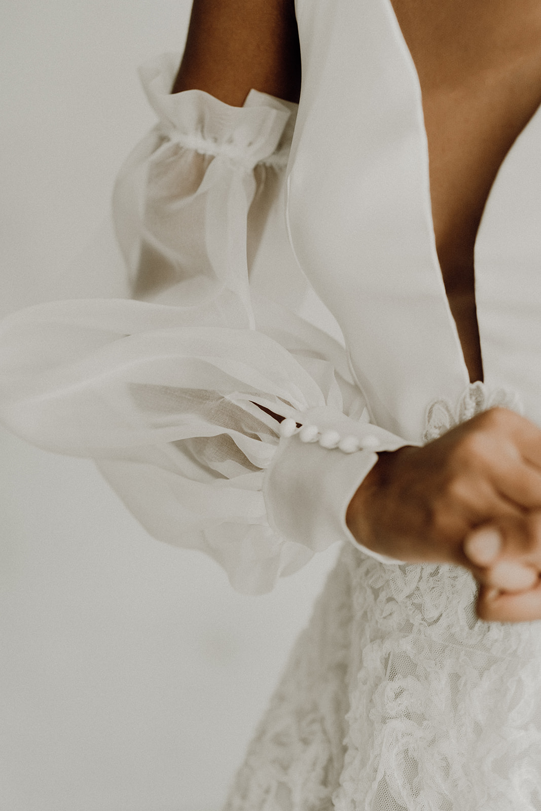 Manches amovibles en organza de soie. Volume froncé et élastiqué au bras et au poignet. Large poignet boutonné.