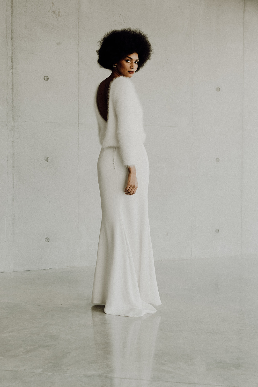 Pull angora tricoté main. Grand décolleté dos, fermetures aux côtés par pressions plastiques. Empiècement de guipure de coton modèle robe de mariée Pauline devant.