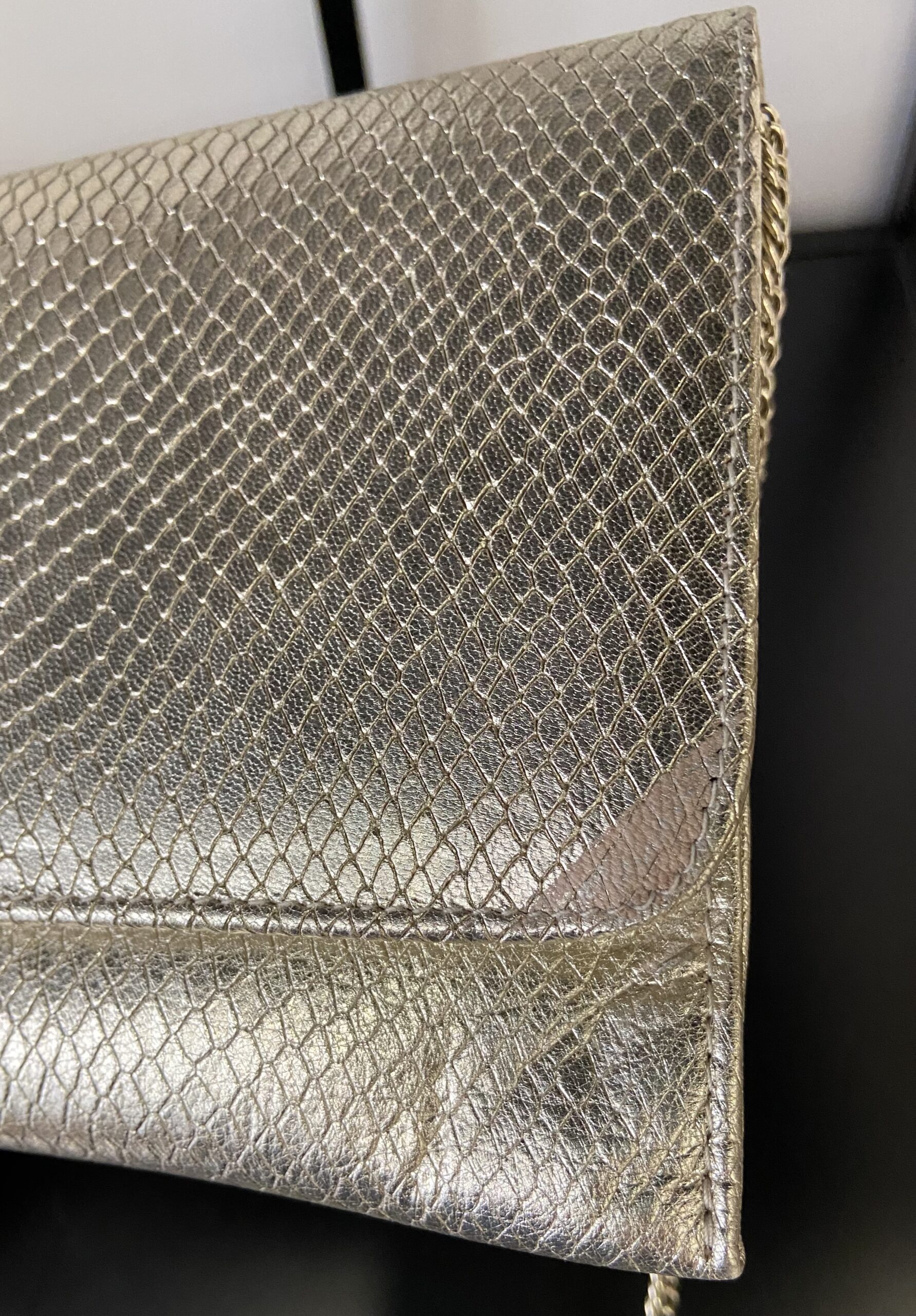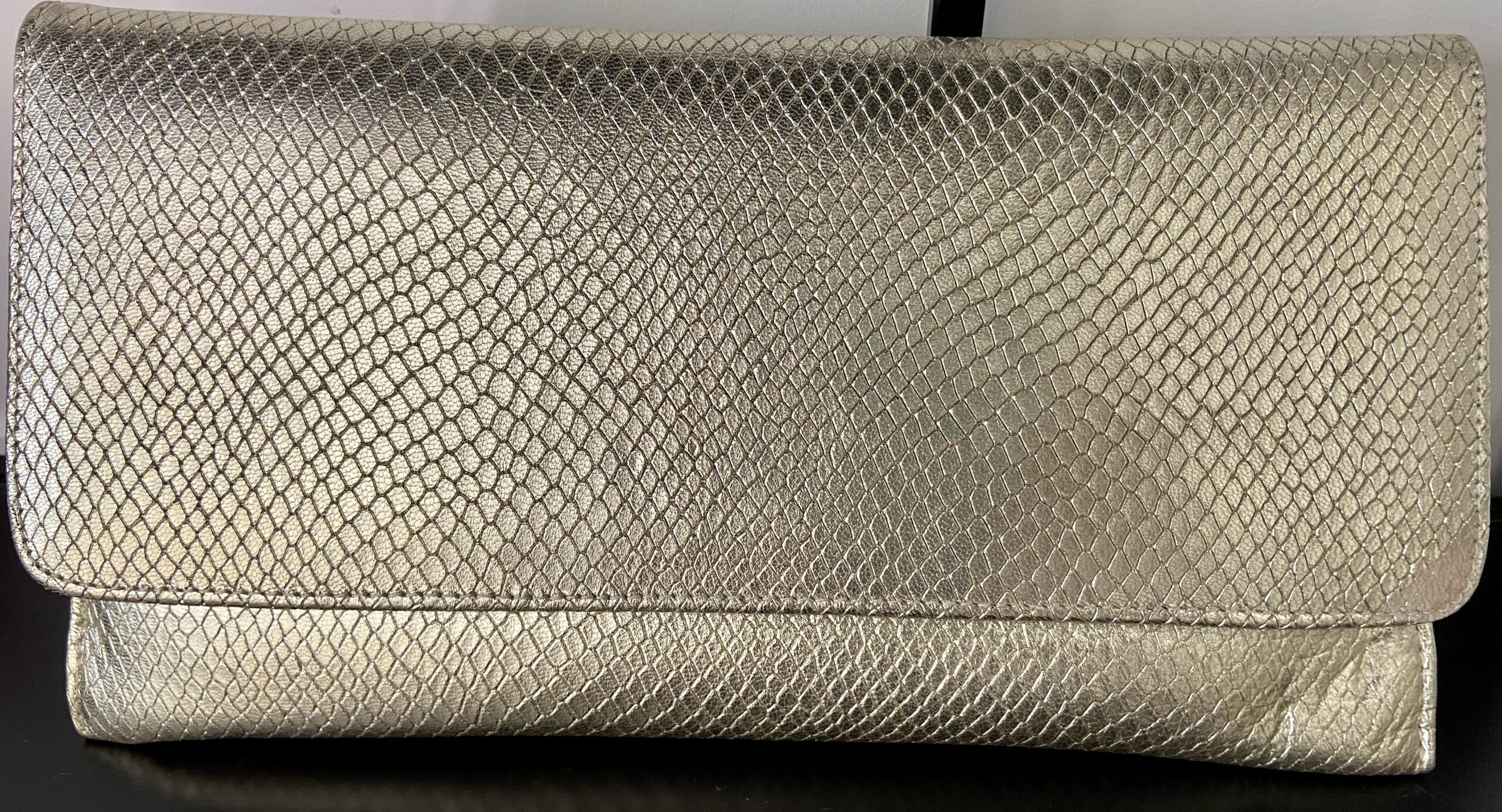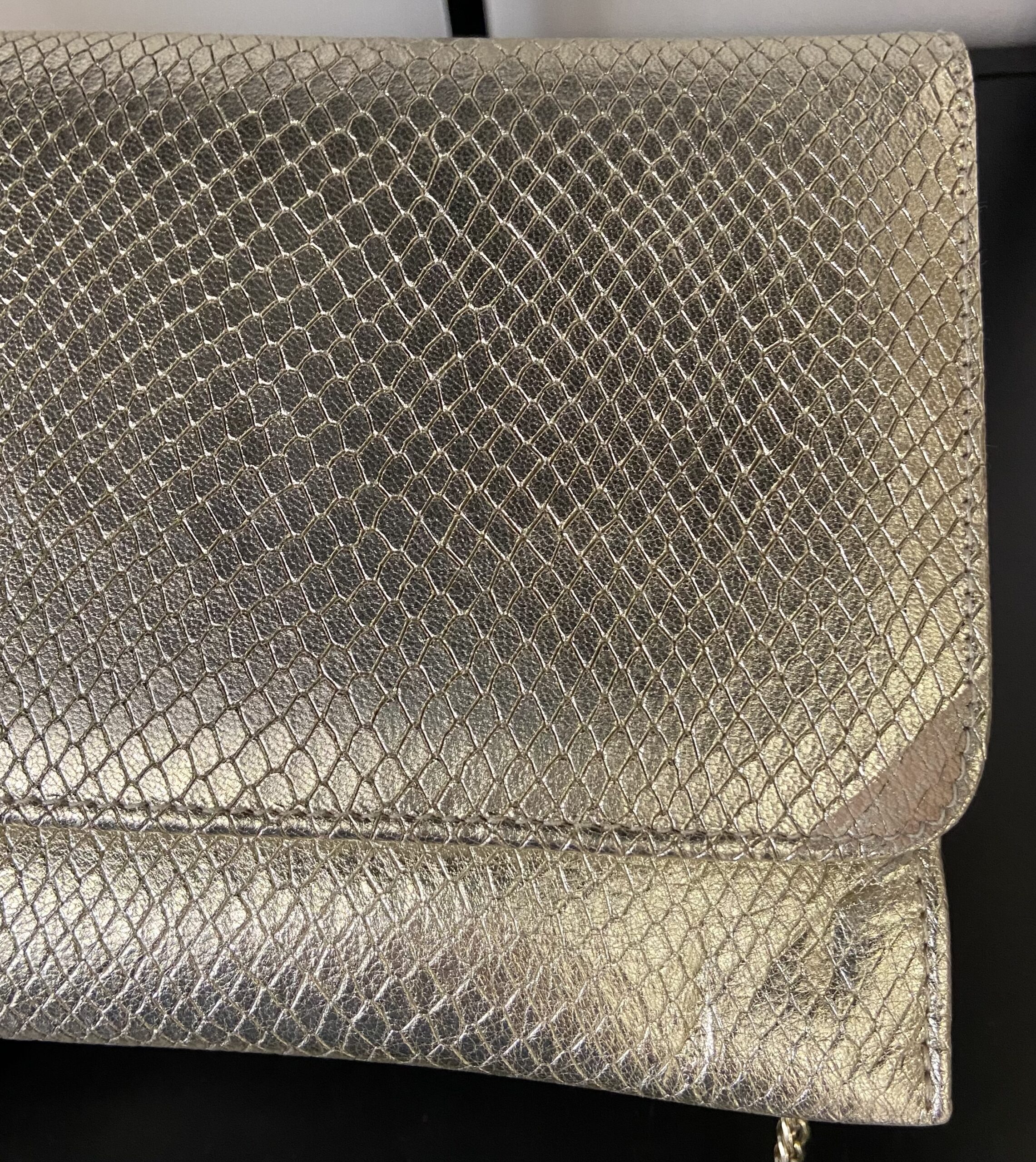 Conçue spécialement pour correspondre au modèle Gigi, cette pochette confectionné en cuir dorée effet peau de serpent est doté d’une belle élégance notamment grâce à ses lignes intemporelles. Une chainette métallique amovible vous permet de le porter en sac ou en pochette.