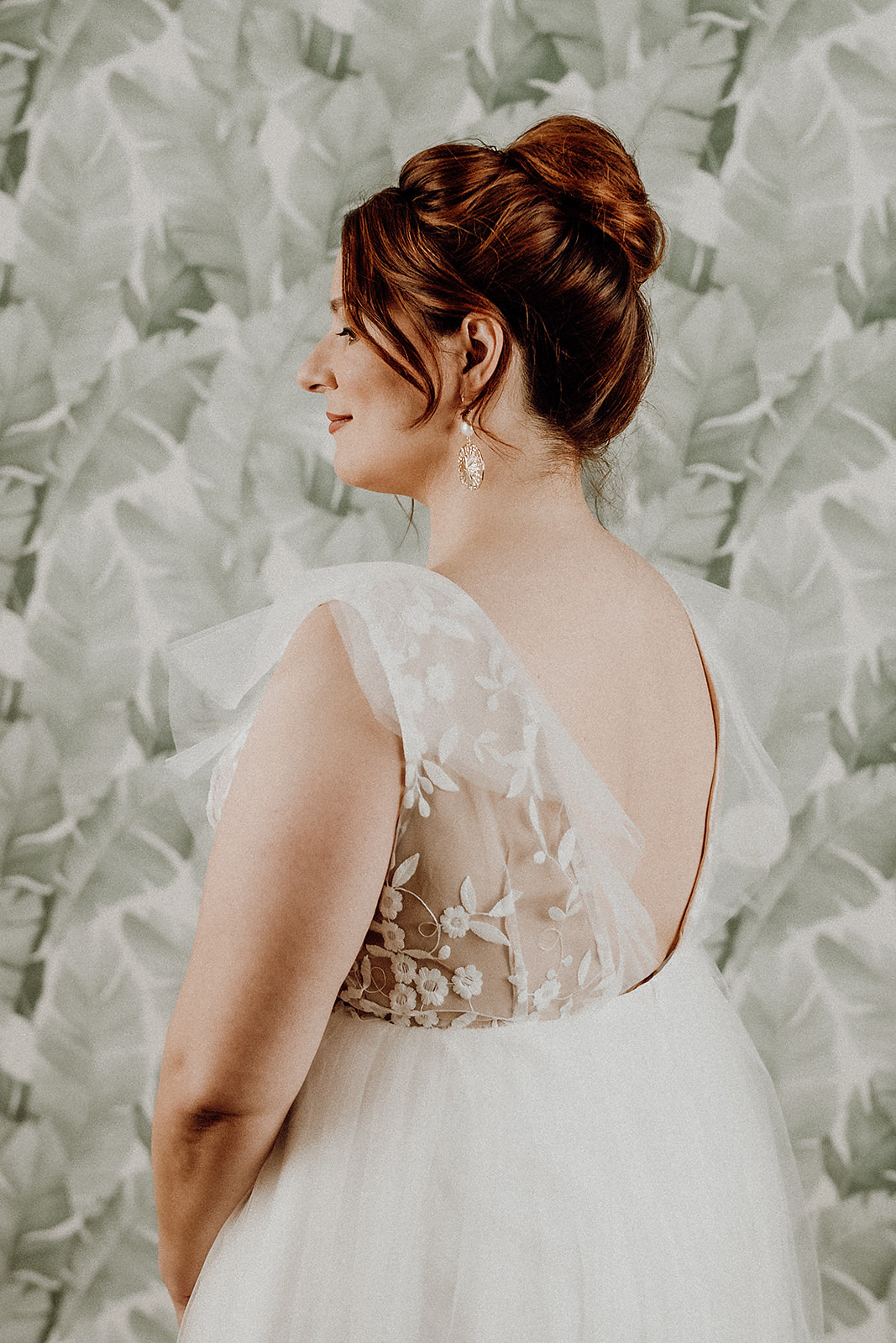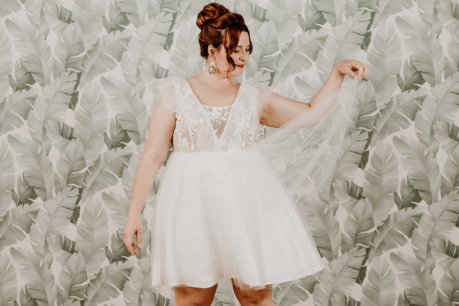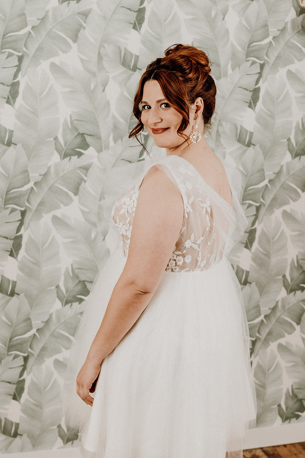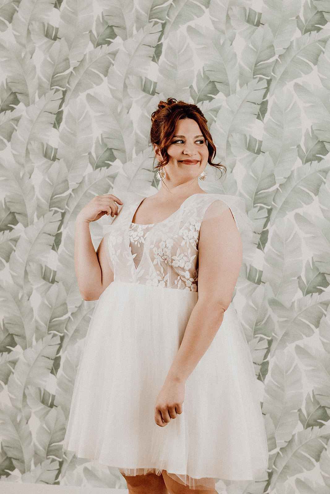 Robe de mariée grande taille, courte en tulle souple et tulle brodé. La jupe froncée en tulle arrive aux genoux. La taille est marquée et le haut en tulle brodé monté sur fond de voile de coton couleur chair donne l’illusion de transparence avec un grand décolleté V au dos et un joli décolleté devant. Le volant en tulle souple part de la taille pour former les manches.