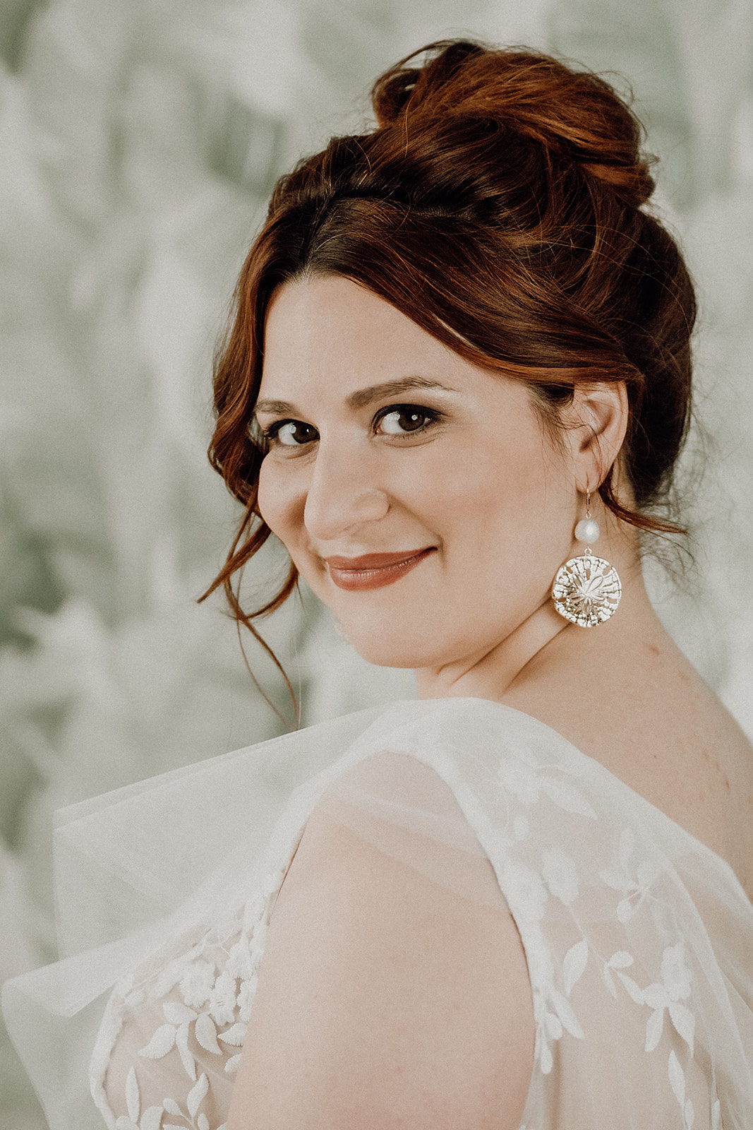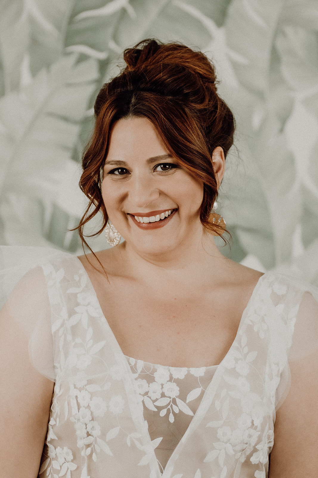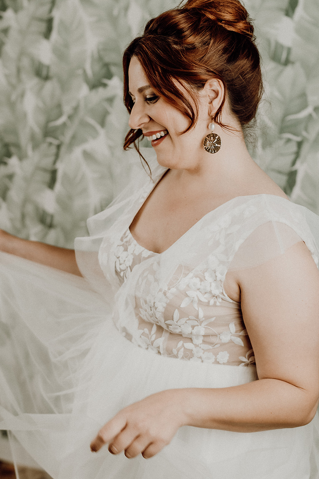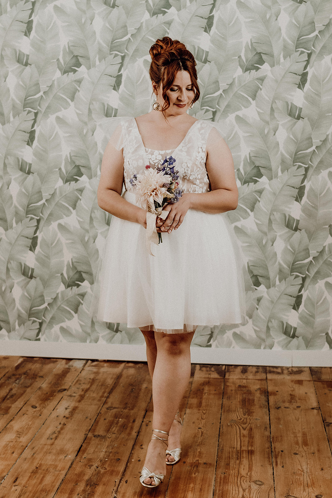Robe de mariée grande taille, courte en tulle souple et tulle brodé. La jupe froncée en tulle arrive aux genoux. La taille est marquée et le haut en tulle brodé monté sur fond de voile de coton couleur chair donne l’illusion de transparence avec un grand décolleté V au dos et un joli décolleté devant. Le volant en tulle souple part de la taille pour former les manches.