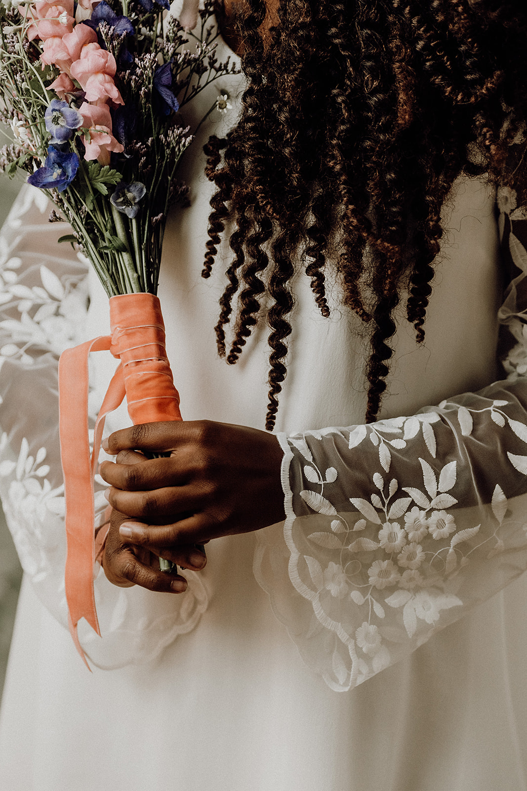 Robe de mariée courte en georgette de soie et tulle brodé. Petit décolleté V devant et fente goute d’eau au dos avec possibilité d’attacher au niveau du soutient-gorge pour le cacher. Emmanchure raglan et manches longues en tulle brodé. Finition de tulle brodé au bas de la robe.