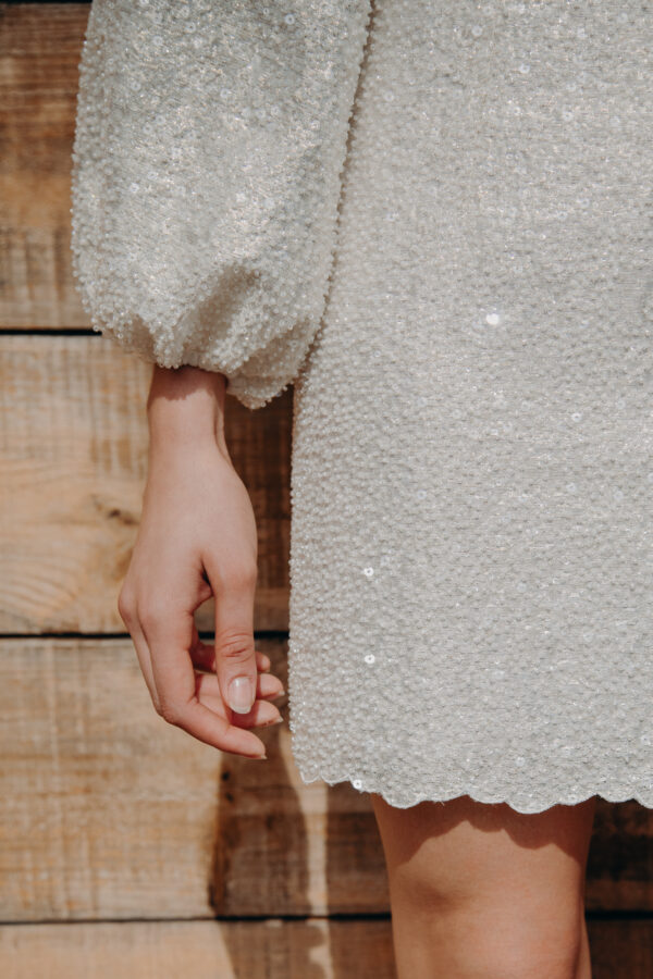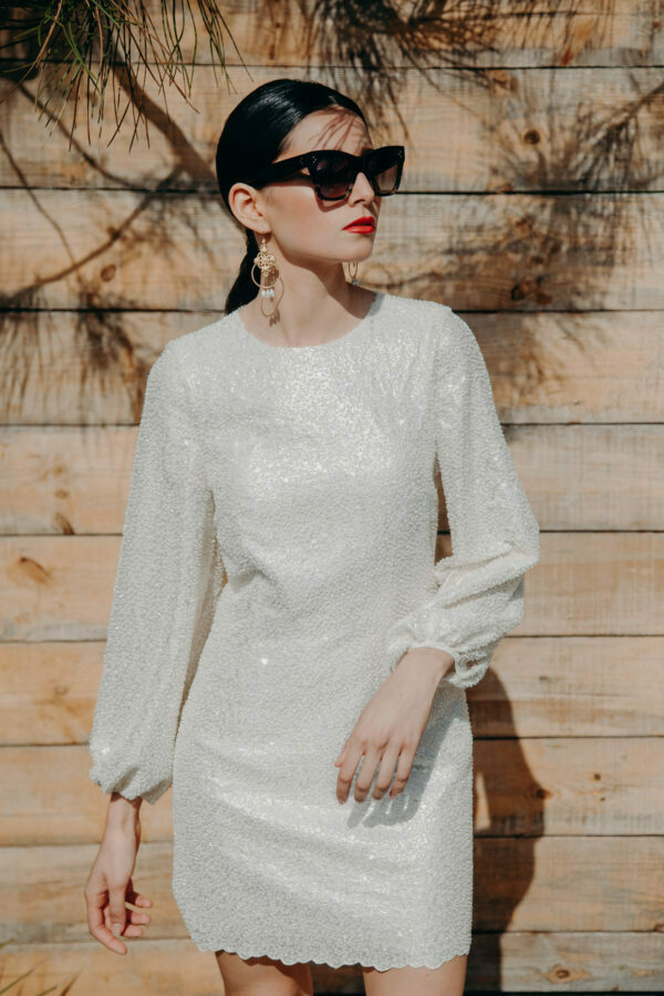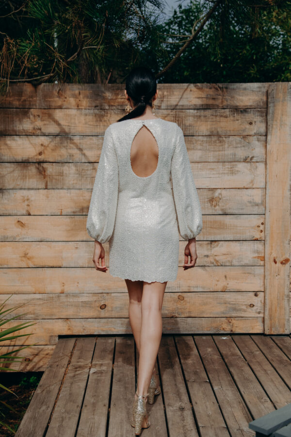 Robe courte en lamé de soie doré et argenté rebrodée de sequins transparents et perles de rocaille blanc soie. Volume ajusté, longueur au dessus du genou (notre mannequin étant très grande, 1m80, les longueurs ne sont pas forcément représentatives). Manches longues, bouffantes au bas avec un poignet élastiqué. Ouverture en goute au dos, 2 petits boutons recouverts de crêpe de soie et brides élastiquées. Bord brodé au bas de la robe.