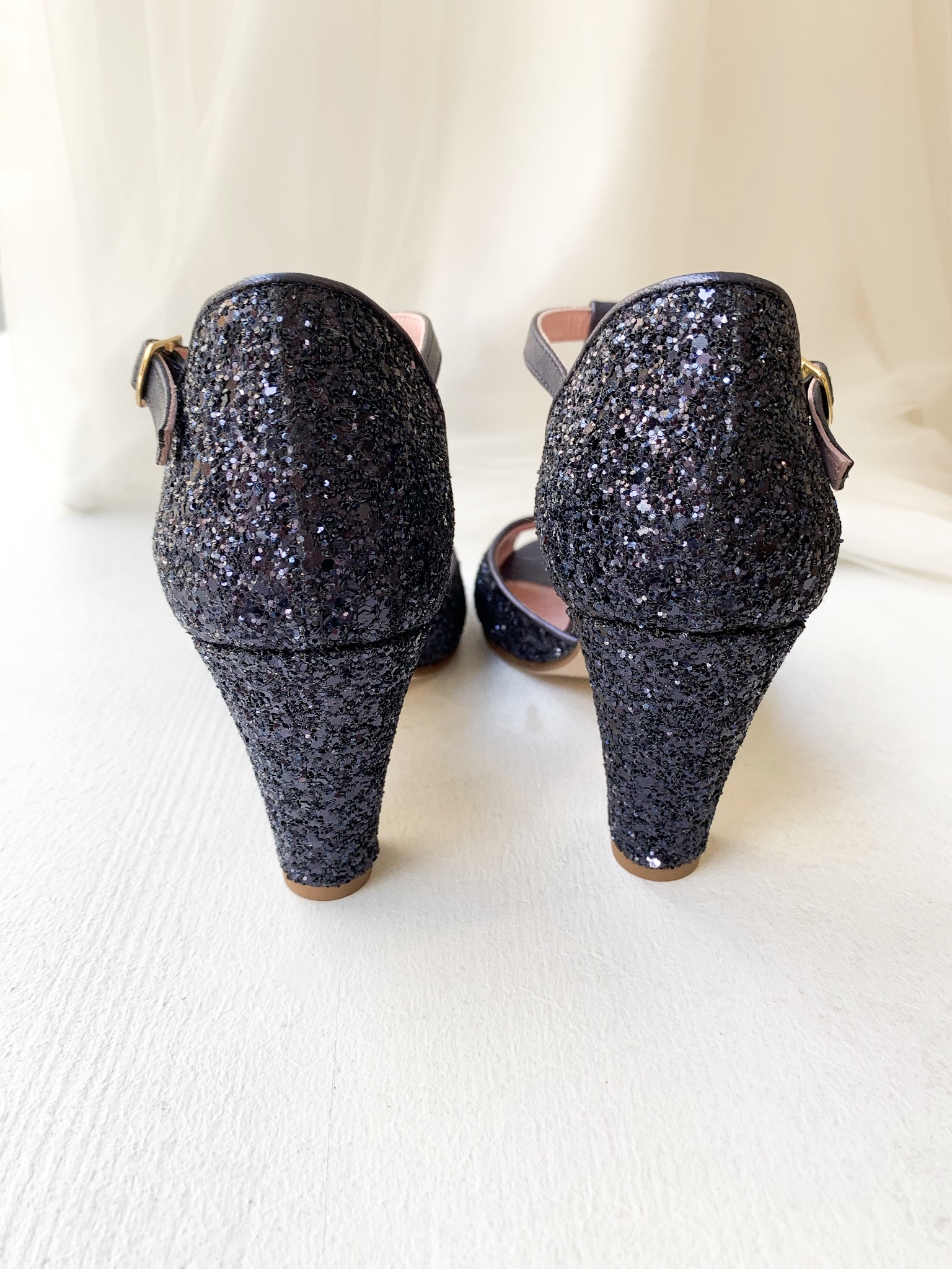 Pour cette collaboration Elise Martimort a revisité les Satanas de Coralie Masson pour les rendre à son image : pétillantes. C’est donc avec de jolies paillettes bleu nuit que les deux créatrices ont imaginé cette nouvelle chaussure. Combo parfait avec une de nos robes civiles