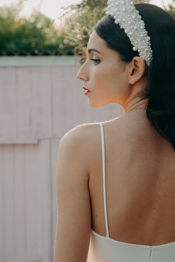Serre-Tête bombé recouvert de crêpe de soie (upcyclée des chutes robes d’Elise Martimort) finition gros grain, orné de perles couture blanches pour un effet très perlé.