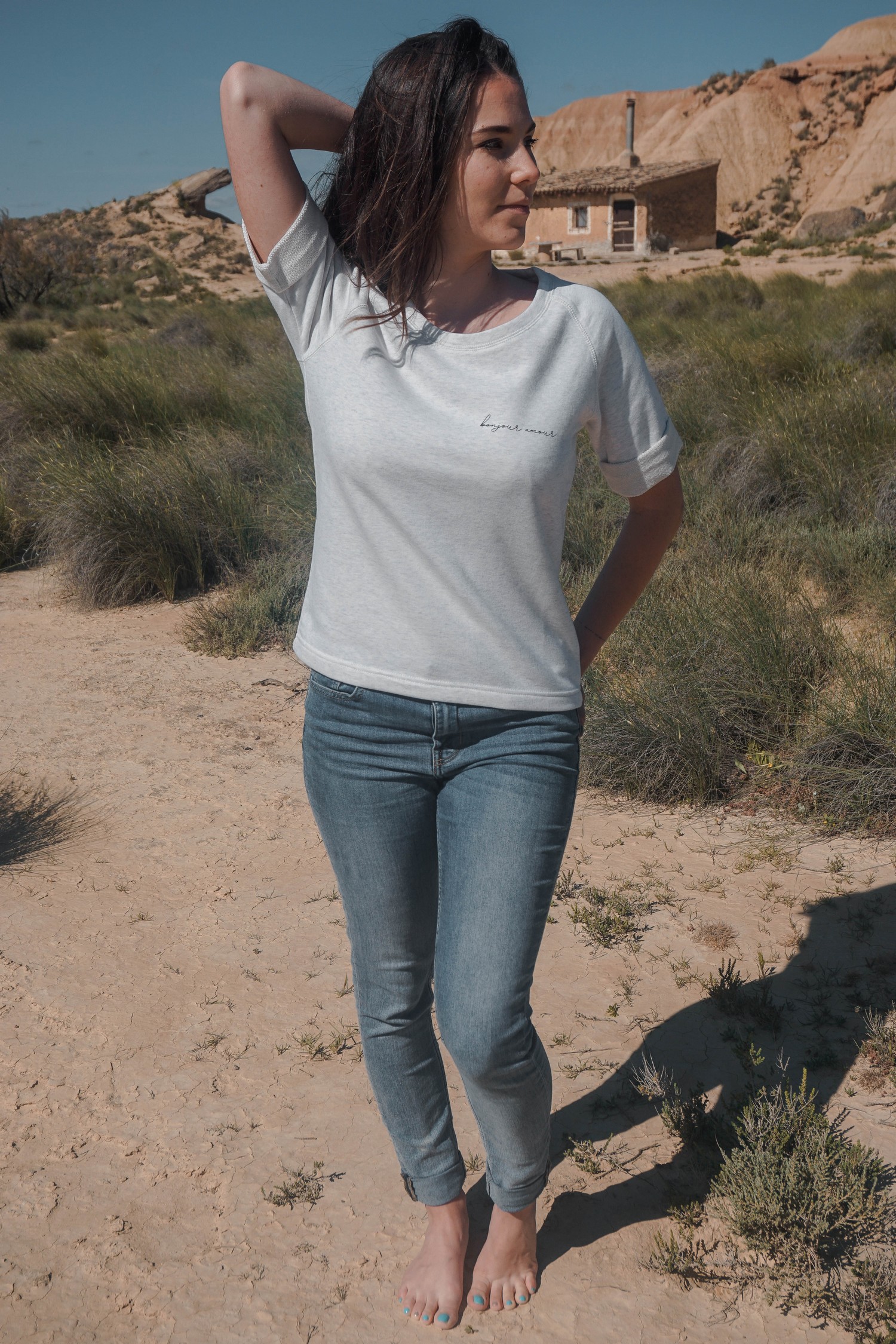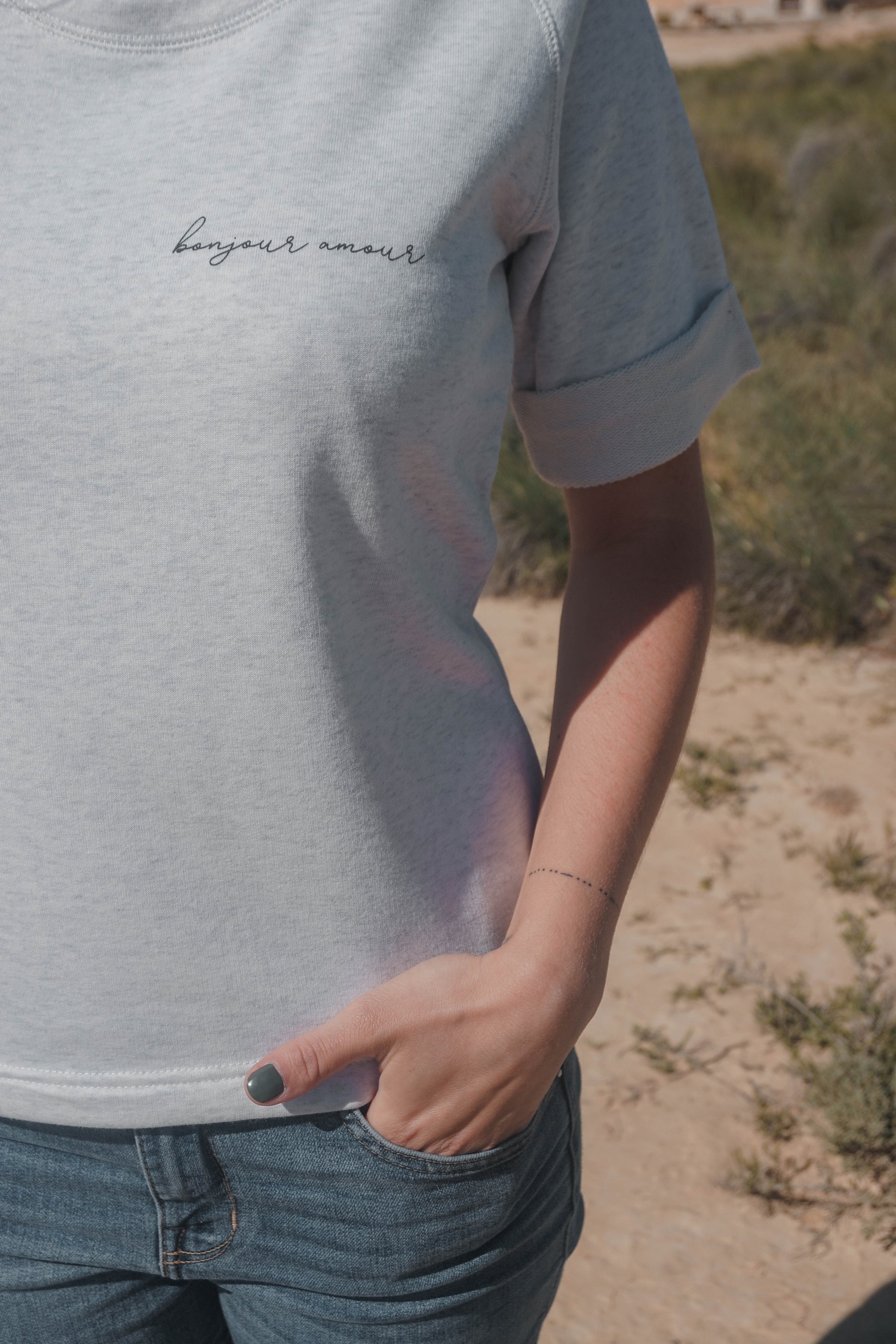 • Imprimé noir « Bonjour amour » sur le devant
