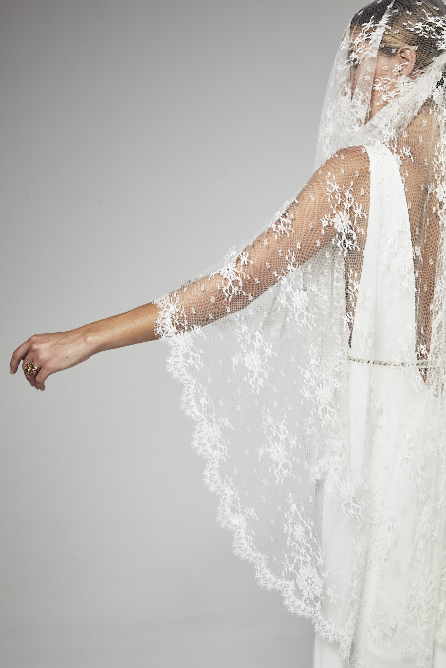 Voile mariage long avec retour monté sur peigne doré brodé main en dentelle de Calais.