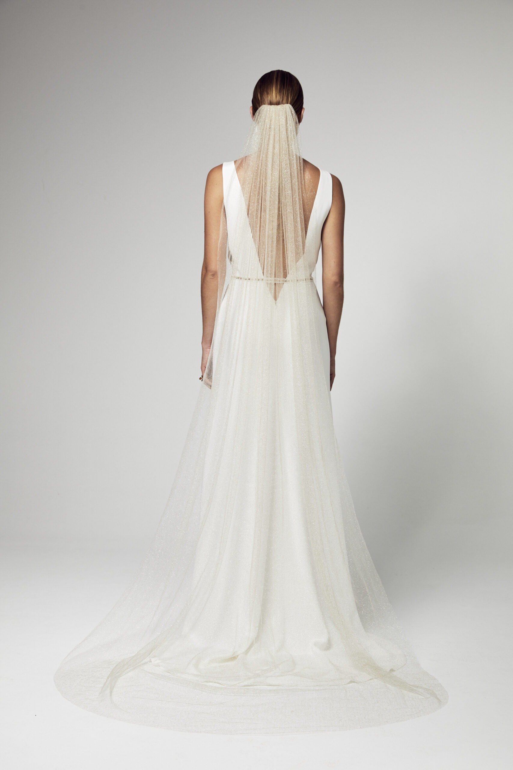 Voile mariage long avec retour monté sur peigne doré brodé main, tulle souple paillettes dorées.