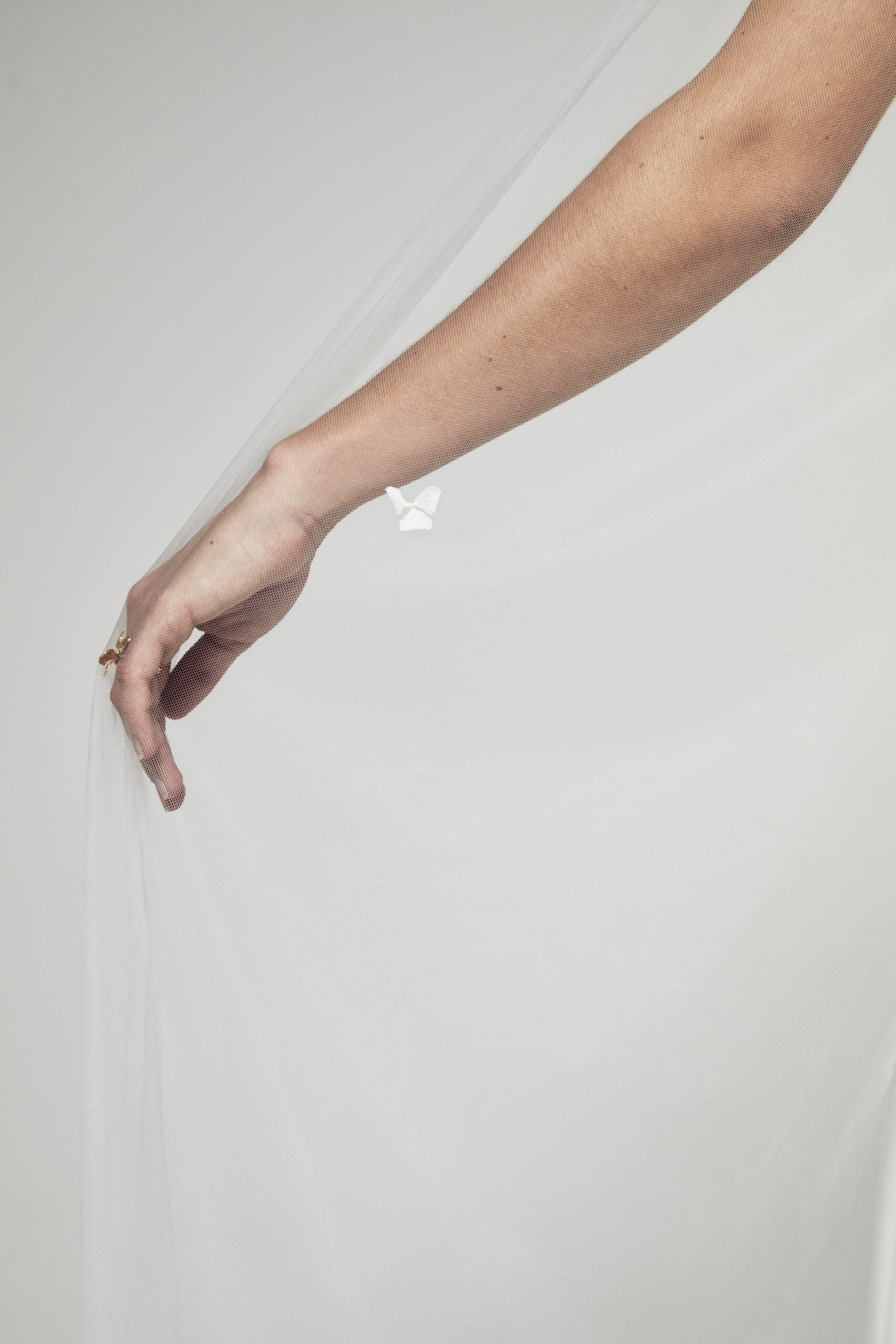 Voile mariage long avec retour monté sur peigne doré brodé main, fleurs stabilisées. Petit Mulan.