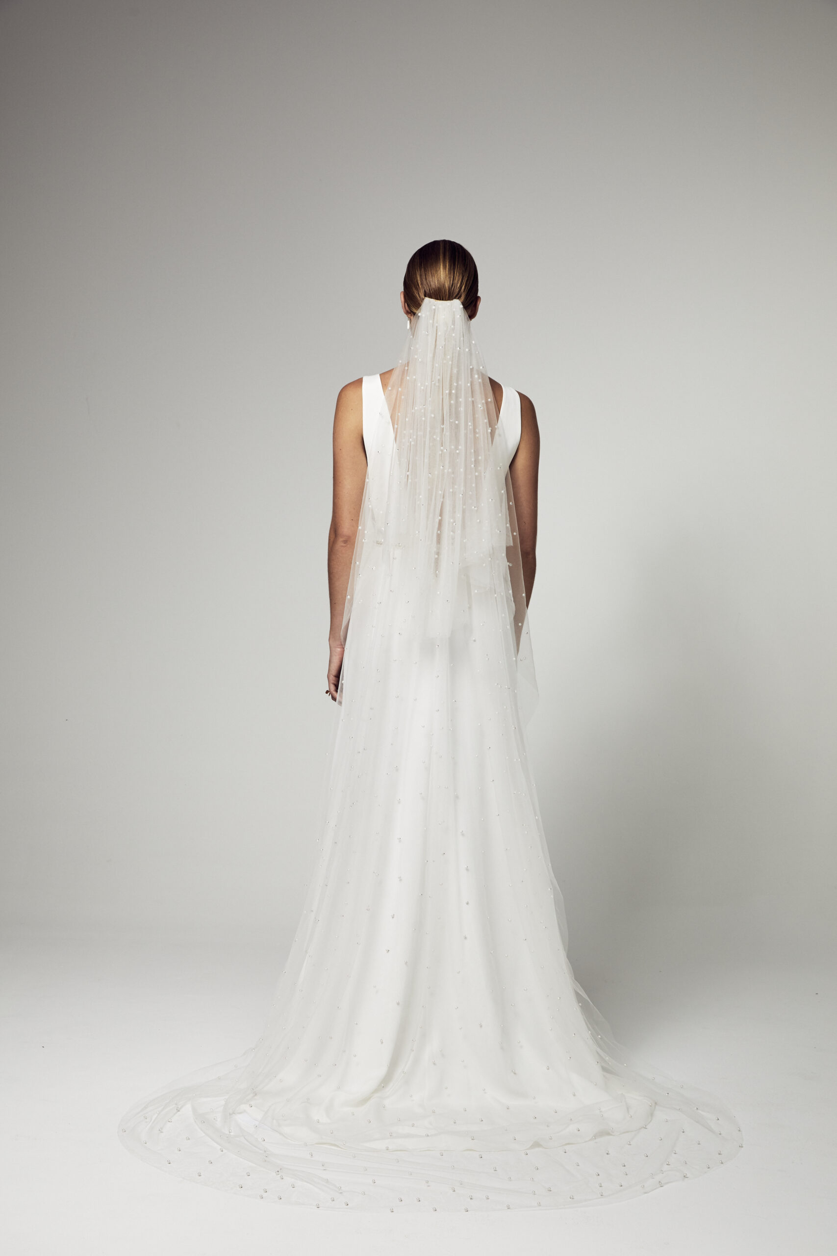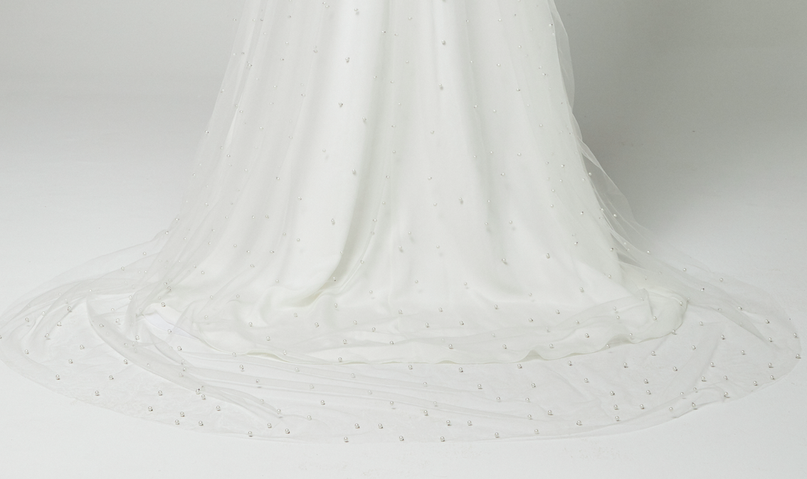 Voile mariage long avec retour monté sur peigne doré en tulle souple perlé.